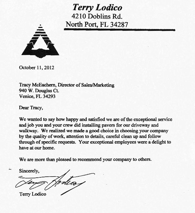 First, we just want to thank you for a fantastic job and great customer service. I highly recommend you and your company to anyone wishing to have pavers installed. There are several reasons that I commend your work and service: